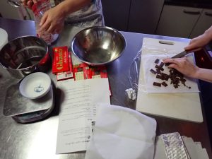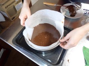 湯煎して溶かしたチョコに生クリームと卵を加えます。